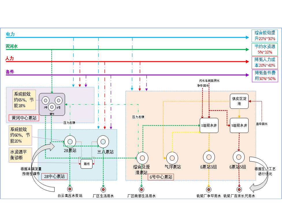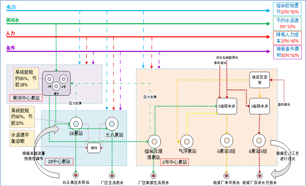 根據工藝用水規律和用水指標,實時調整水系統的供水及水的轉換,既節約能耗又提升工藝品質。