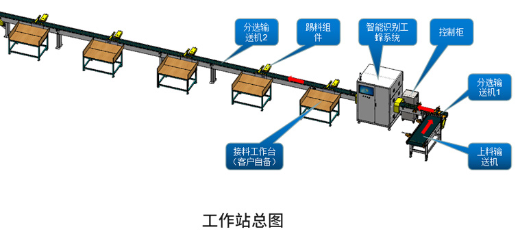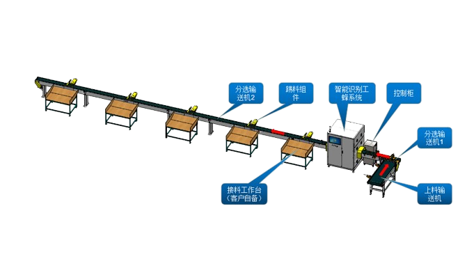 木材原料分揀(分級分色)工作站用于木材加工行業對于木材的篩選分類;基于木材表面缺陷進行數據建模,融合數據庫、前端可視化、后端服務、機器視覺、AI大模型、神經網絡算法、數據挖掘等多種技術對木材的缺陷進行精準識別,結合企業工藝標準得到木材等級,配合PLC進行邏輯控制,輔以高速氣缸進行踢料,從而為木材原料分級分色。
